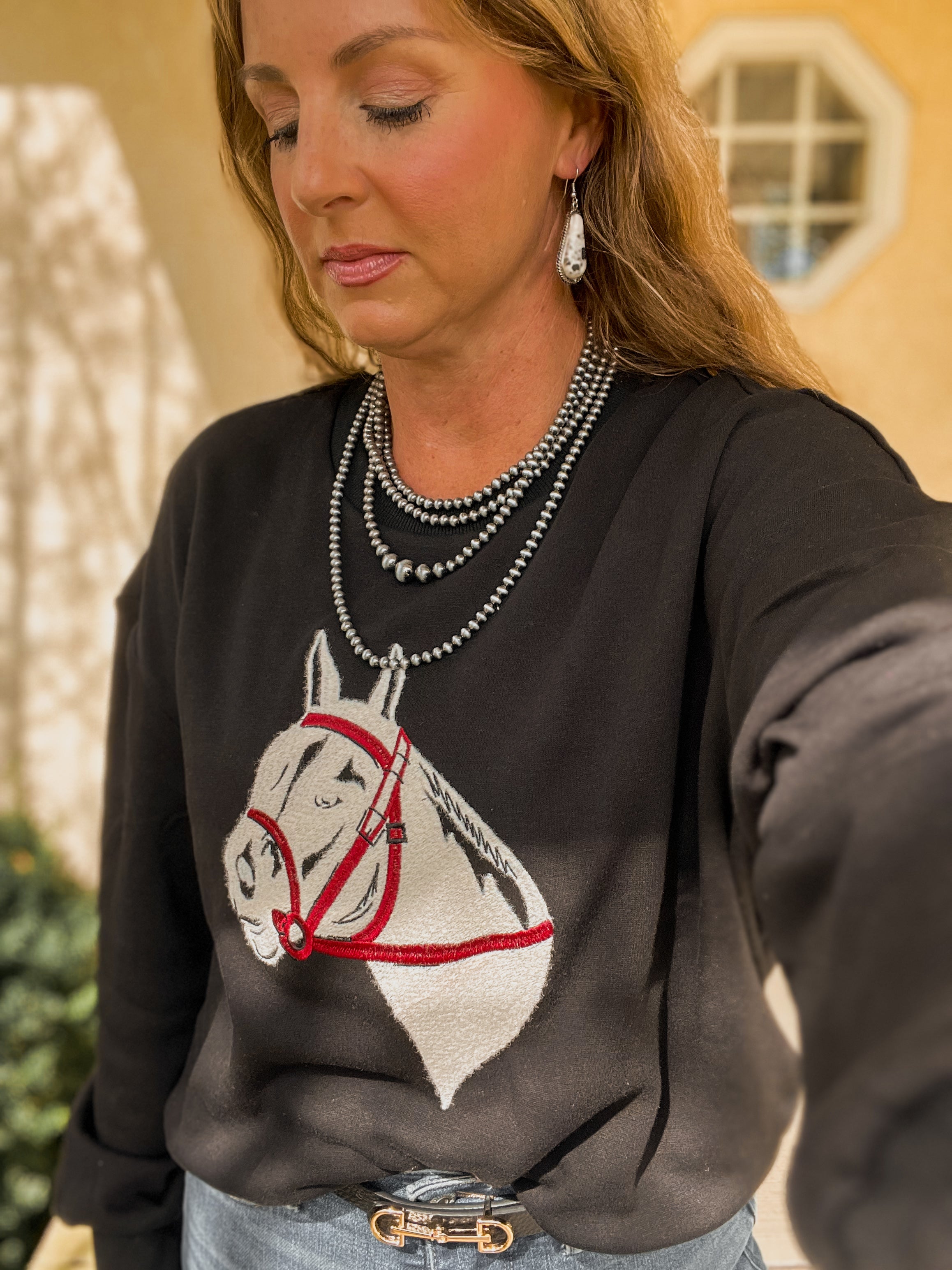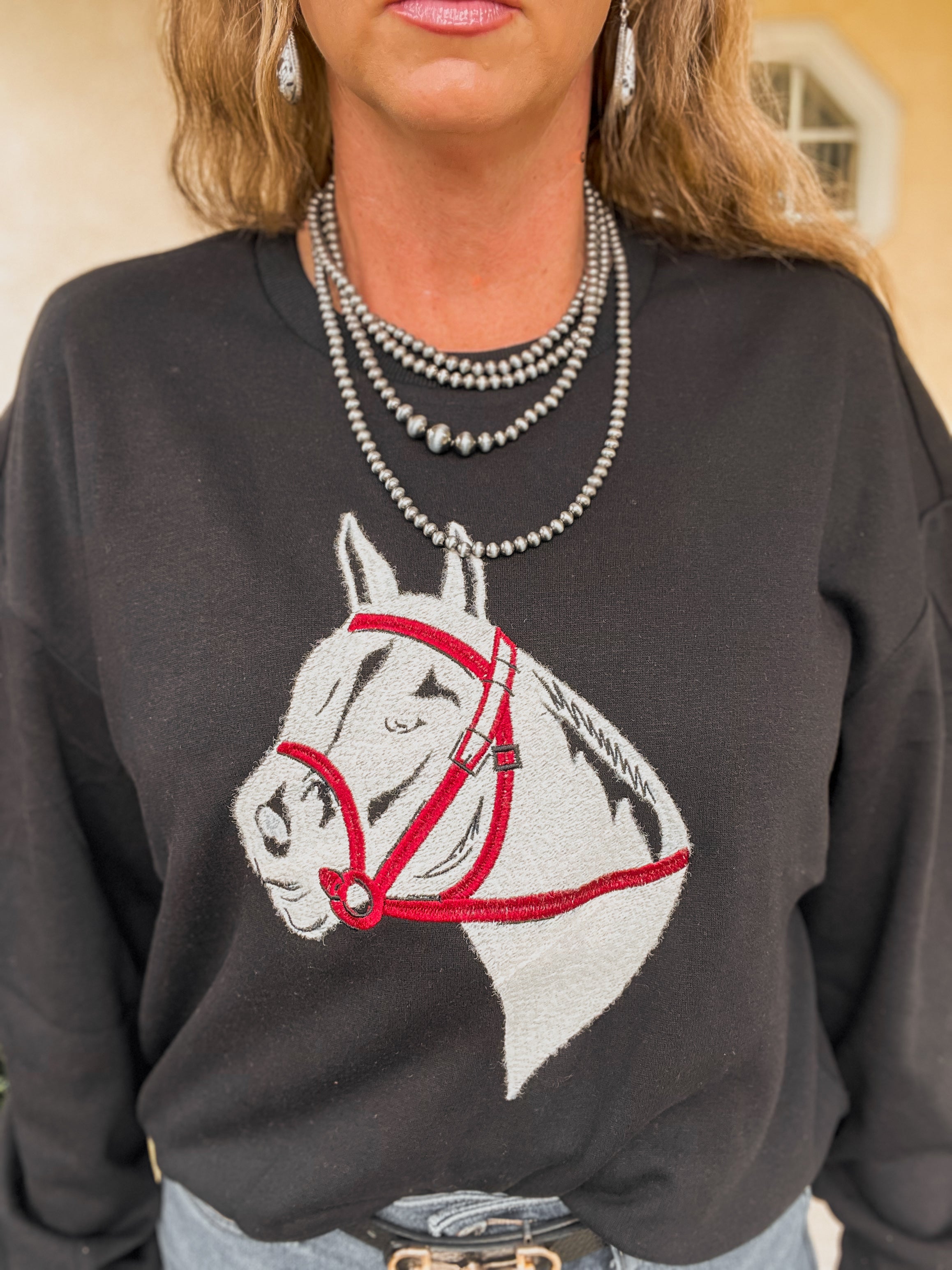 This sweatshirt is giving all the vintage western feels! The material is so softy and dreamy. The colors are perfection and we love a horse detail. 60% cotton, 40% polyester.