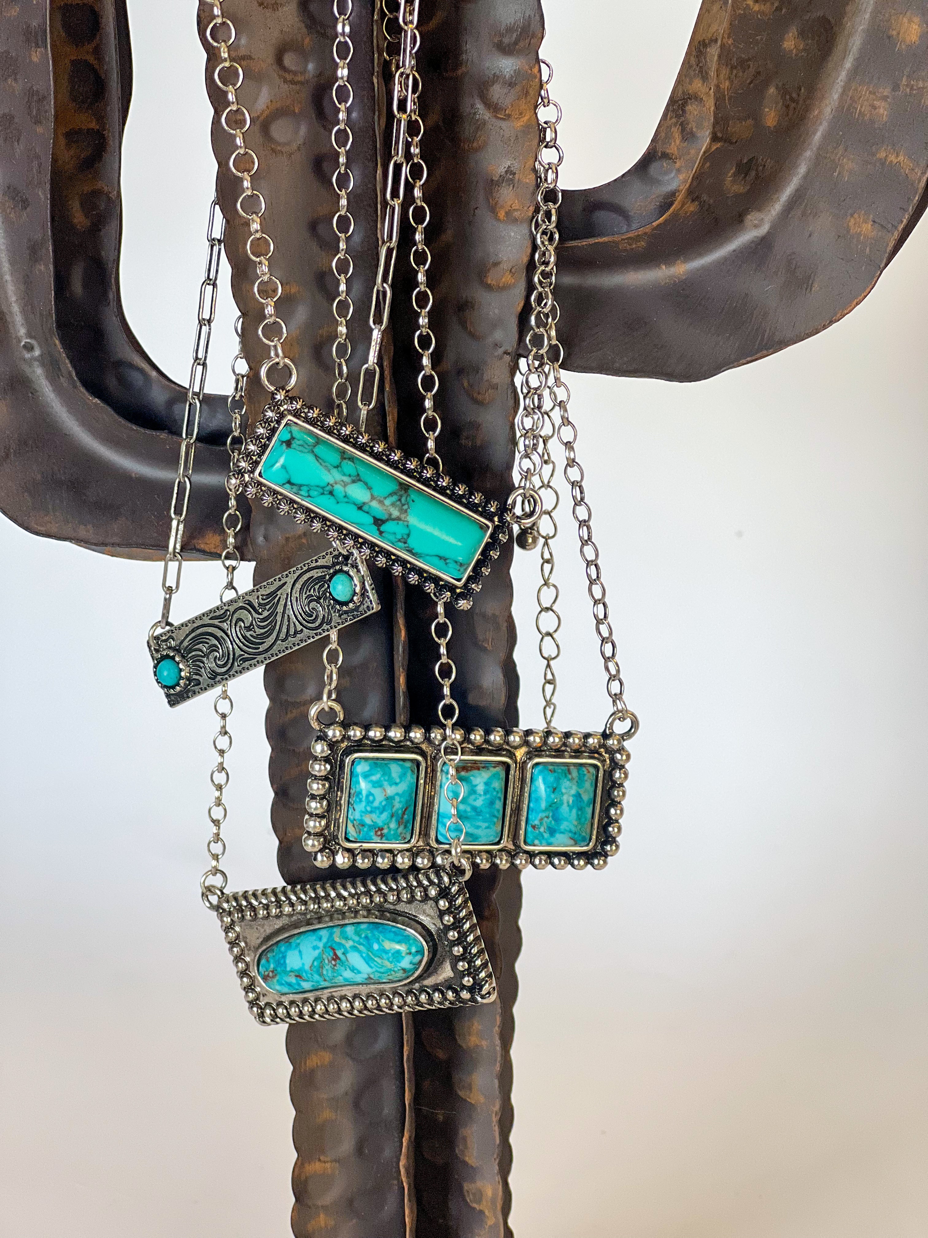 The Open Range Bar Necklace is that effortless piece your jewelry collection has been missing. Featuring a sleek metal bar accented with turquoise, this necklace brings just the right amount of Western character and the perfect layering piece.